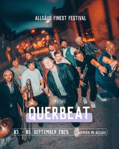 Querbeat ist eine Mischung aus Festivalband, Jazz-Cracks, Karneval und einer Prise Punk-Attitude. Crowdsurfen, Moshpits, Sommervibes und bewegende Live-Momente – die Band lebt für die Bühne und den Energie-Rausch zwischen Publikum und Musik. Mit Brass-Instrumenten, klarer politischer Haltung und rauem Gesang machen sie sich im September auf den Weg ins Allgäu.
